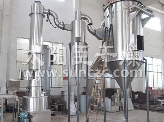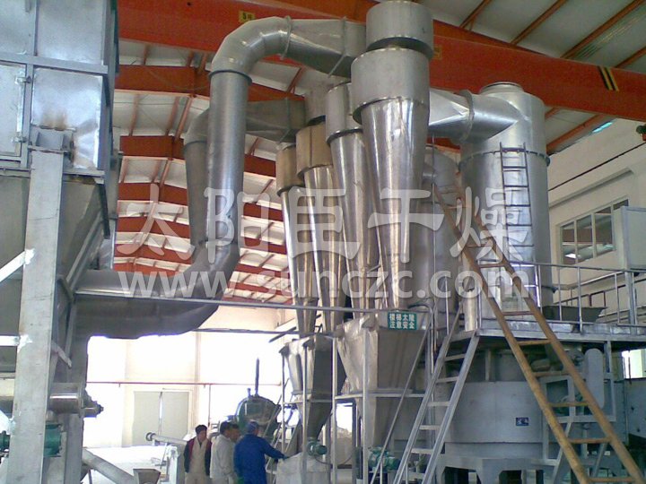 本機組工作過程為料液通過隔膜泵高壓輸入,噴出霧狀液滴,然后同熱空氣并流下降,大部分粉?!?/i>